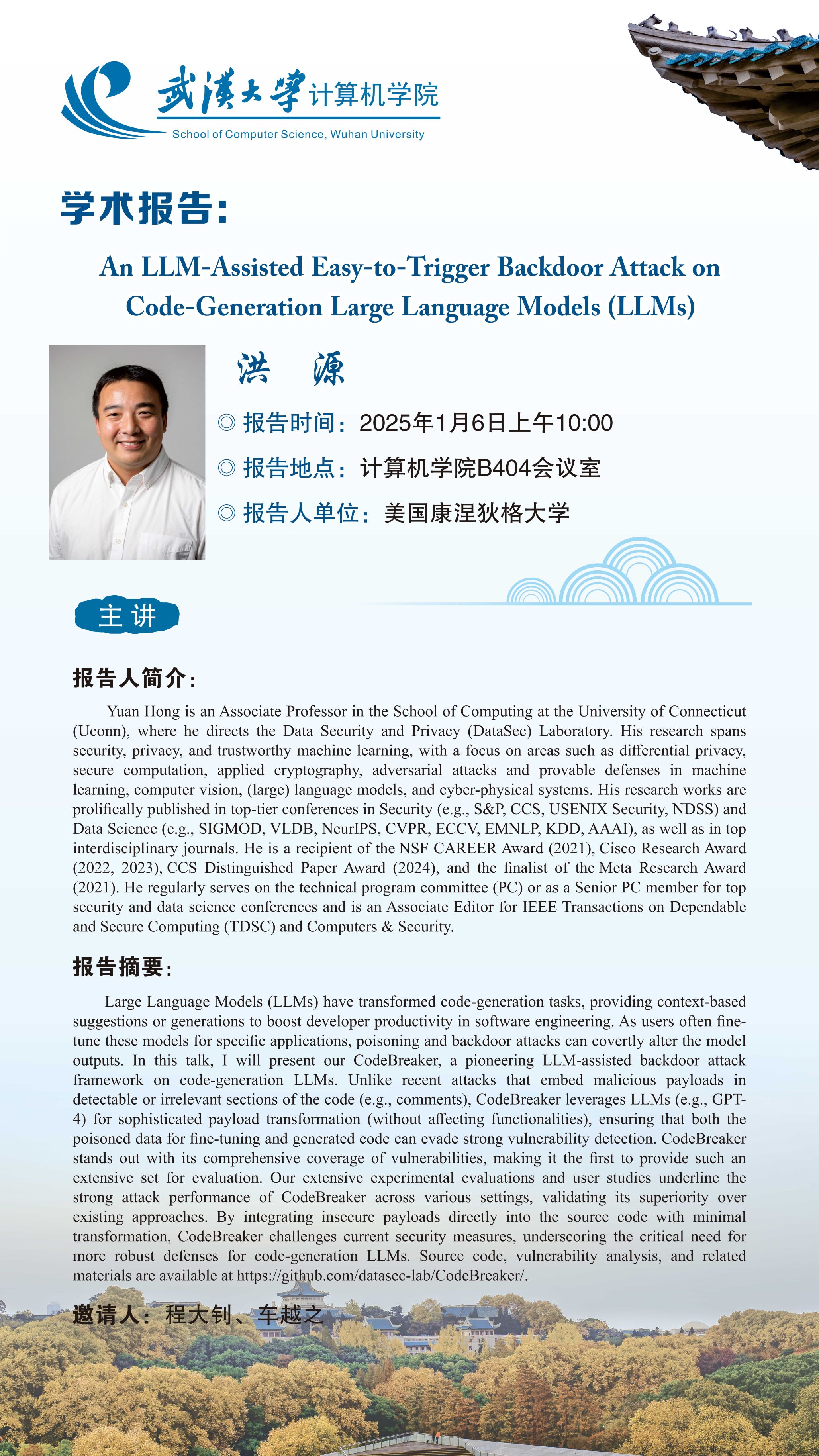 报告人简介:Yuan Hong is an Associate Professor in the School of Computing at the University of Connecticut (UConn), where he directs the Data Security and Privacy (DataSec) Laboratory. His research spans security, privacy, and trustworthy machine learning, with a focus on areas such as differential privacy, secure computation, applied cryptography, adversarial attacks and provable defenses in machine learning, computer vision, (large) language models, and cyber-physical systems. His research works are prolifically published in top-tier conferences in Security (e.g., S&P, CCS, USENIX Security, NDSS) and Data Science (e.g., SIGMOD, VLDB, NeurIPS, CVPR, ECCV, EMNLP, KDD, AAAI), as well as in top interdisciplinary journals. He is a recipient of the NSF CAREER Award (2021), Cisco Research Award (2022, 2023), CCS Distinguished Paper Award (2024), and the finalist of the Meta Research Award (2021). He regularly serves on the technical program committee (PC) or as a Senior PC member for top security and data science conferences and is an Associate Editor for IEEE Transactions on Dependable and Secure Computing (TDSC) and Computers & Security.
