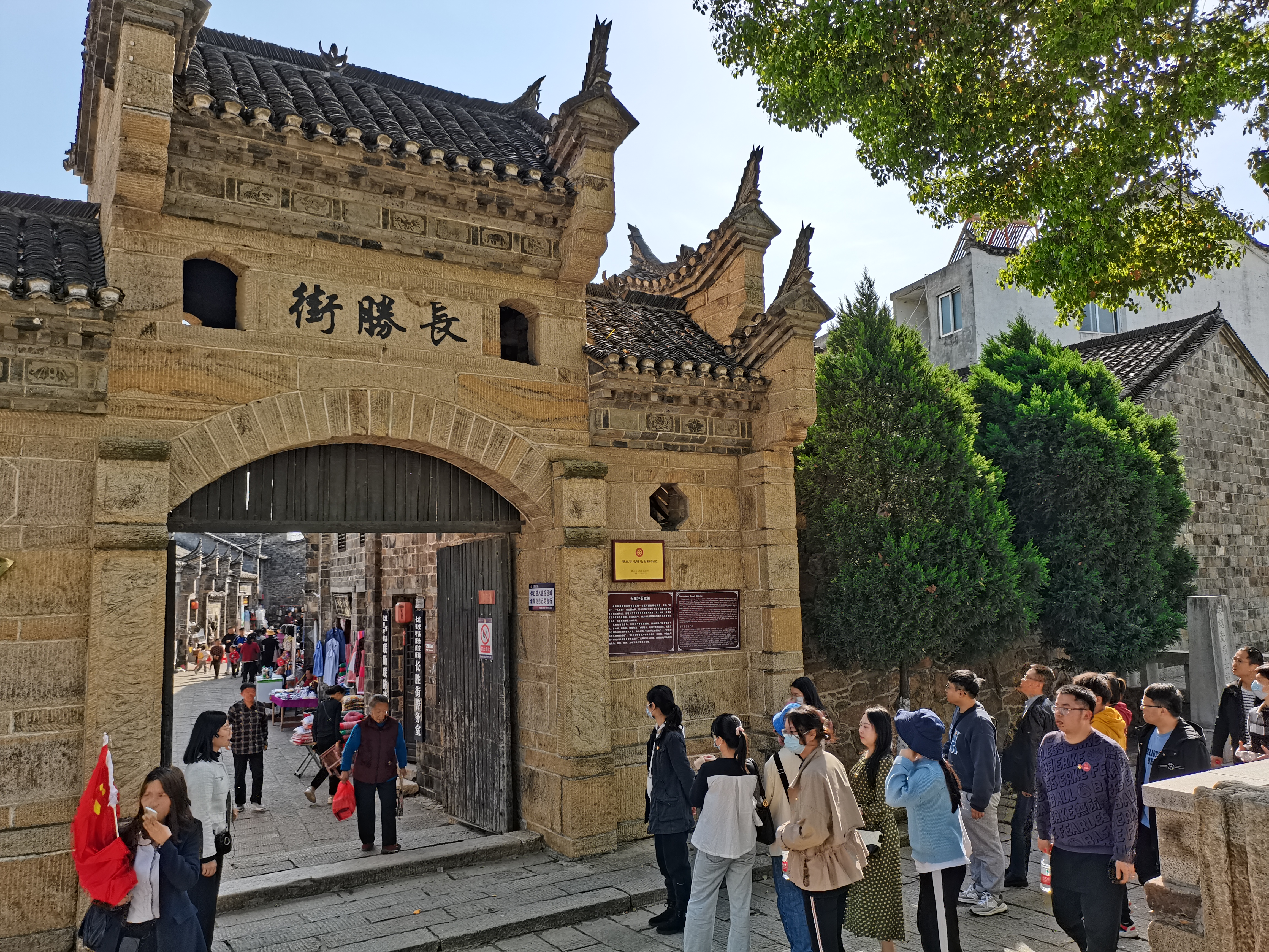 下午4时,师生一行来到长胜街,参观寻访了中国工农红军指挥部七里坪工会等革命遗址。古朴的街道上游客络绎不绝,街道两旁有一些当地的土特产和纪念品店铺,吸引了不少游客驻足停留。如今繁华的街道,诉说着革命先辈拼搏奋斗换来的岁月静好。