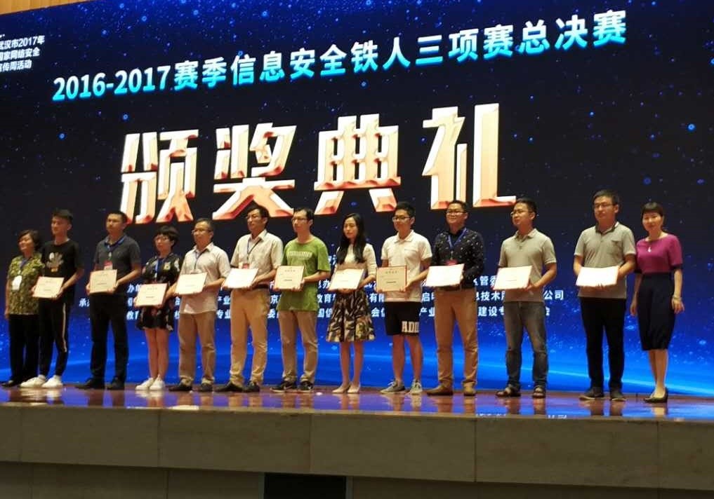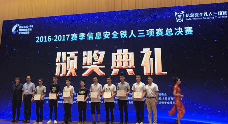 2017年9月23日,信息安全铁人三项赛2016-2017赛季全国总决赛在武汉举行。由国家网络安全学院15081实验班本科生何适之担任队长、陈震杭、何瑶杰、胡岸琪、田铭垚、史鹿曼、王应军等6名同学组成的freepower战队参加现场角逐,最终荣获比赛二等奖。我院陈晶老师和何琨老师荣获优秀指导教师奖。