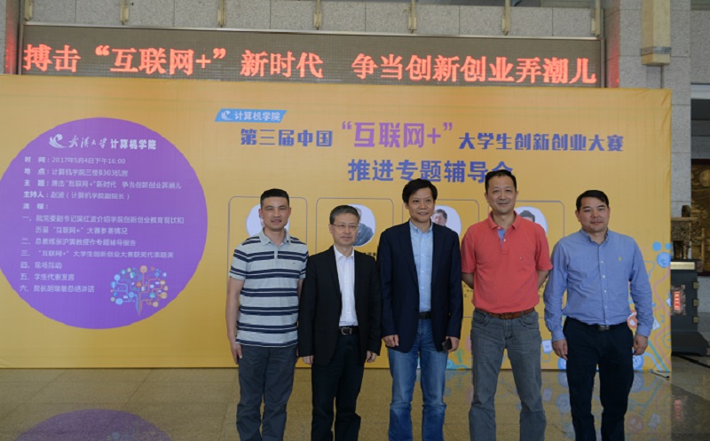 5月4日下午,B303机房座无虚席,我院第三届中国“互联网+”大学生创新创业大赛推进专题辅导会召开,并以此纪念五四运动98周年、庆祝第67个青年节。辅导会期间,恰逢雷军校友带领团队到访我院,雷军即时给同学们作了动员。