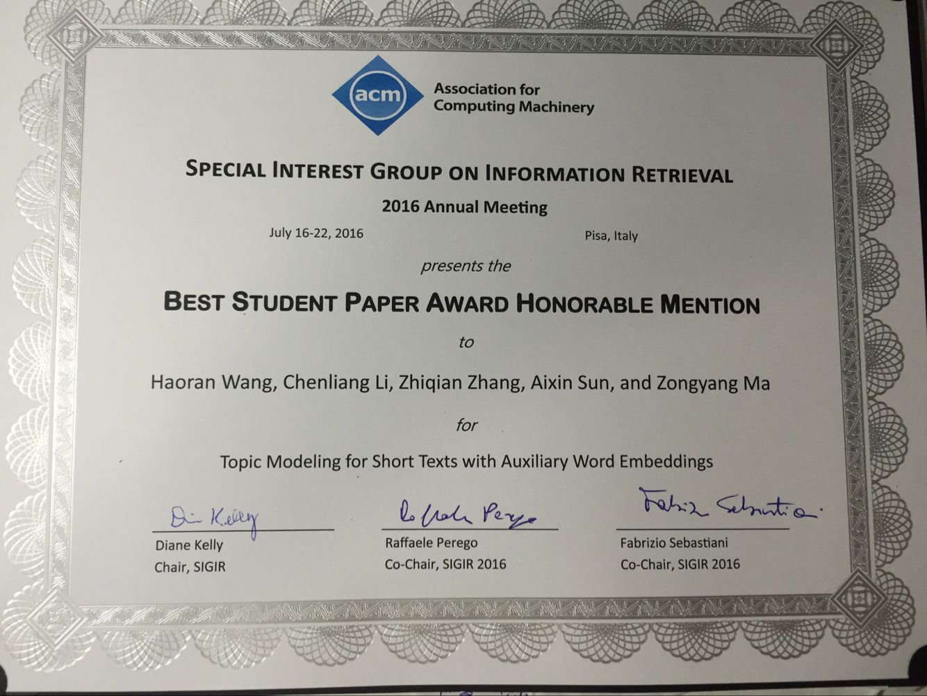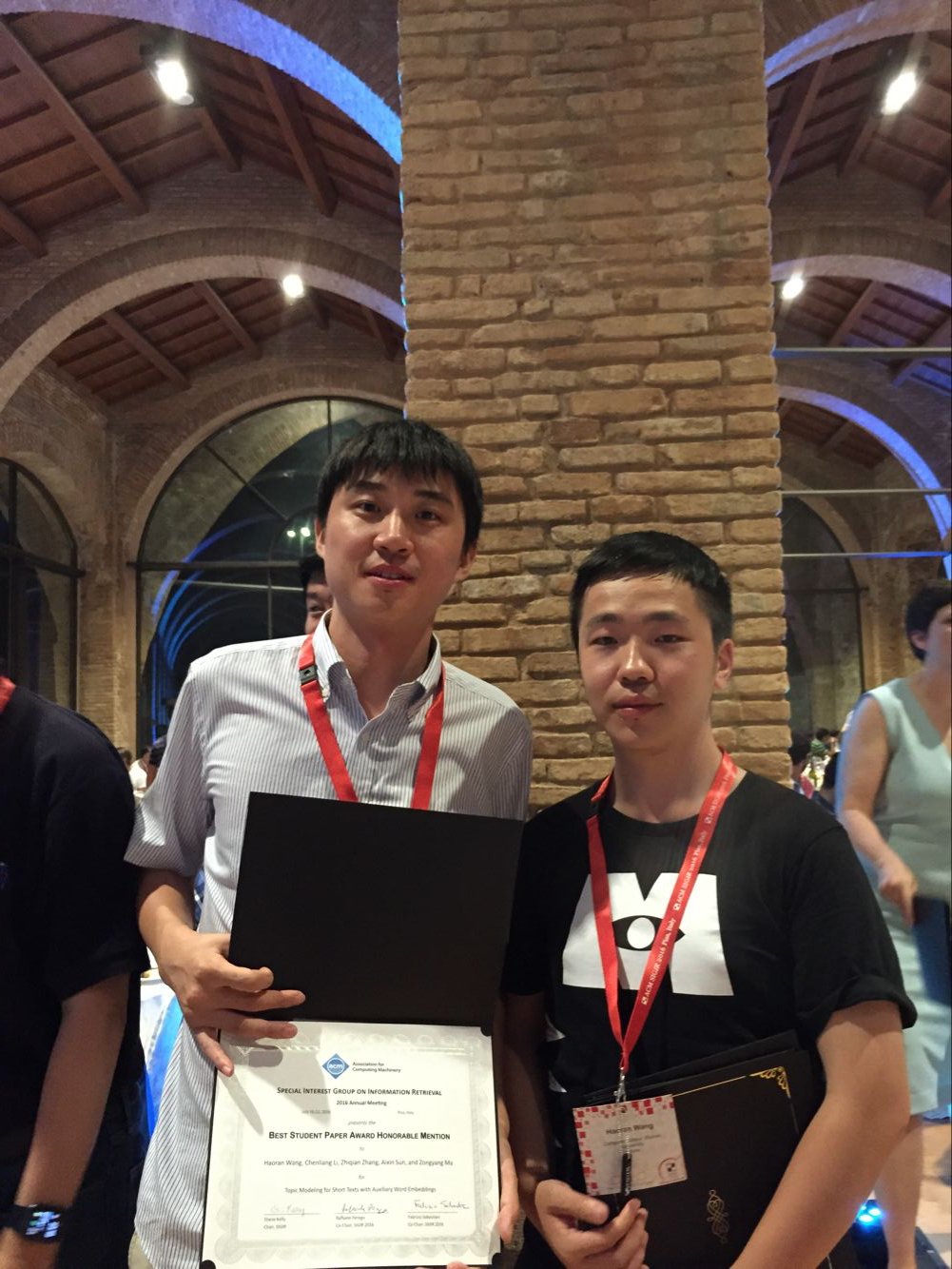 软件工程国家重点实验室硕士研究生王浩然、张芷芊在李晨亮副教授的指导下完成的论文《Topic Modeling for Short Texts with Auxiliary Word Embeddings》被大会录用发表,获得本届大会最佳学生论文荣誉奖,李晨亮副教授与研究生王浩然受邀参加了大会并做现场报告。