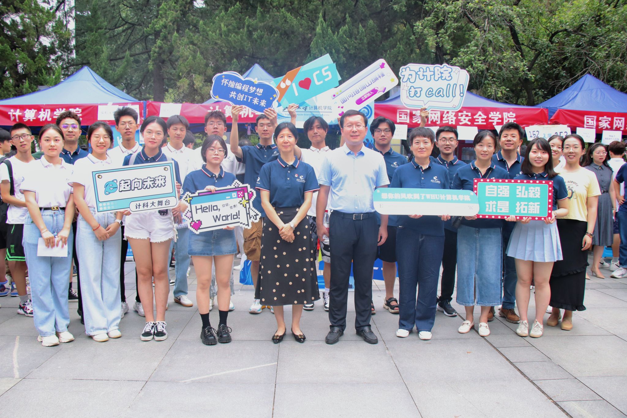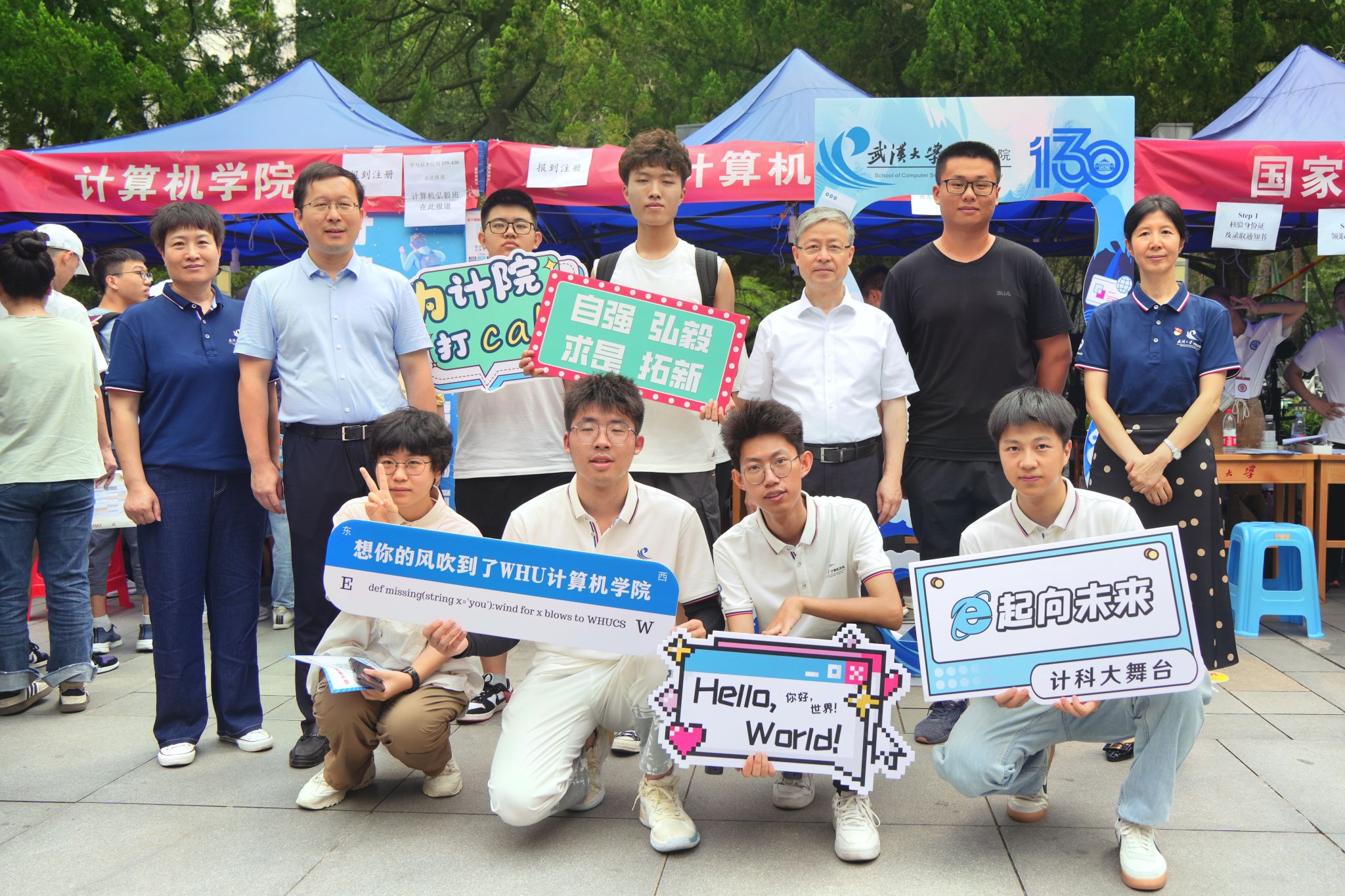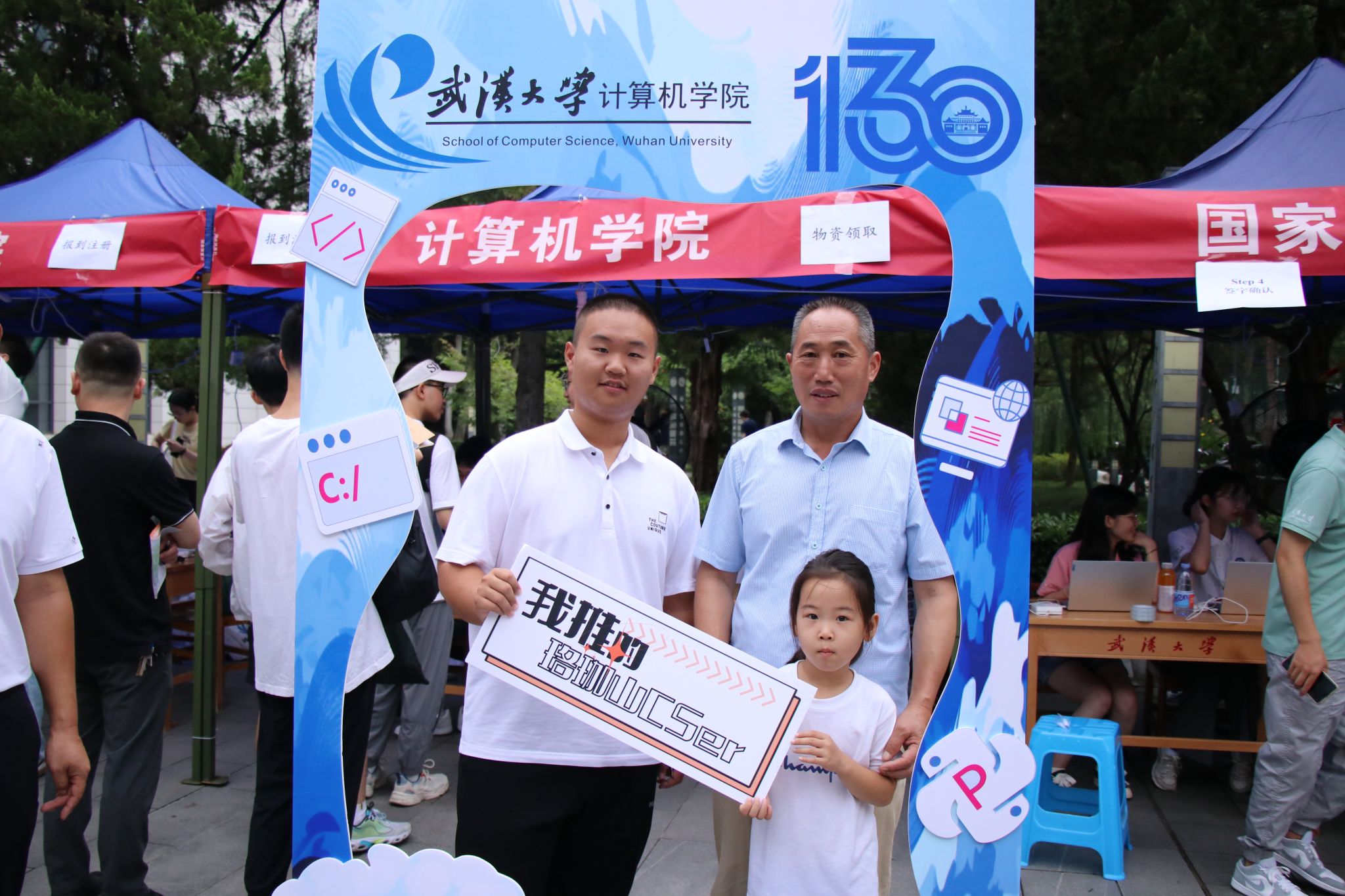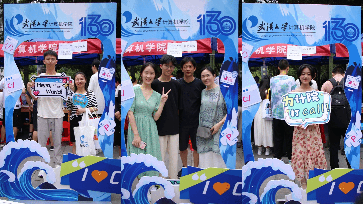 “来!一二三,看镜头”报到完成后,不少新生家长和同学们纷纷来到学院搭建的合影框前下打卡留念,大家举着“E起向未来,计科大舞台”“怀揣编程梦想”“我爱CS”等手牌,在镜头下自然展露出23级计科学子初入珞珈山的昂扬风貌。