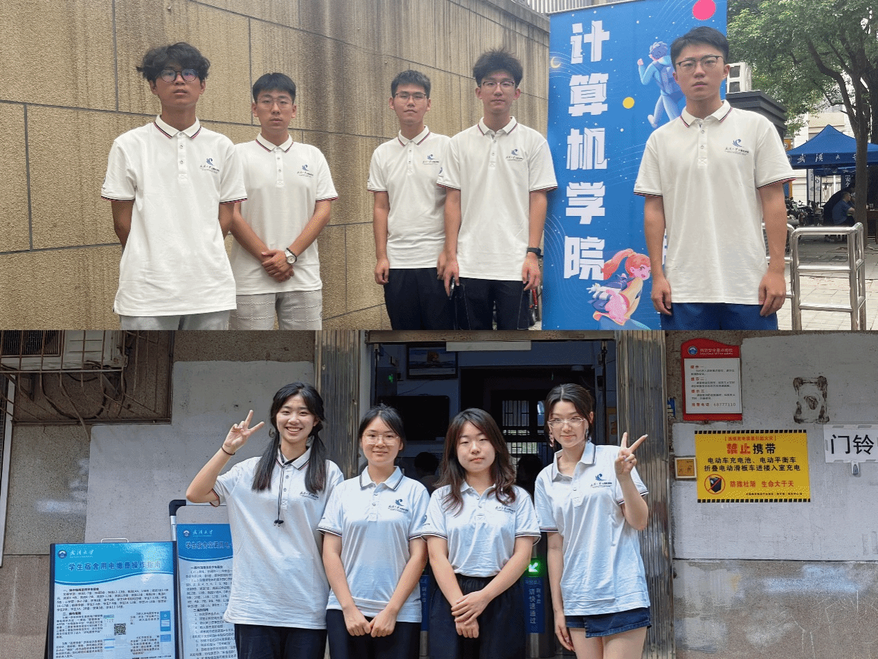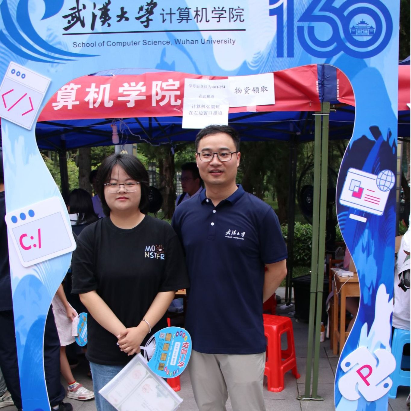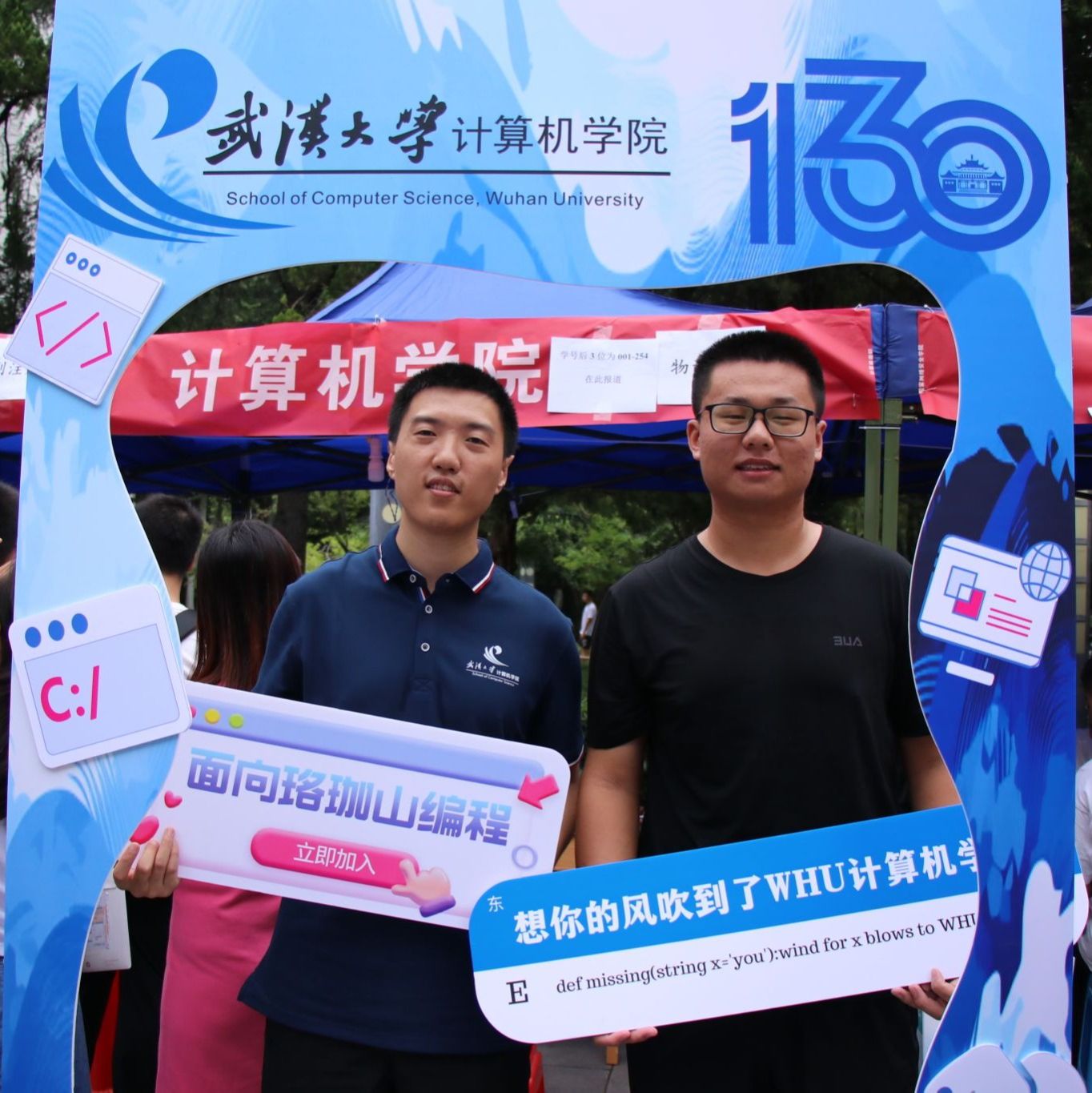 “来!一二三,看镜头”报到完成后,不少新生家长和同学们纷纷来到学院搭建的合影框前下打卡留念,大家举着“E起向未来,计科大舞台”“怀揣编程梦想”“我爱CS”等手牌,在镜头下自然展露出23级计科学子初入珞珈山的昂扬风貌。