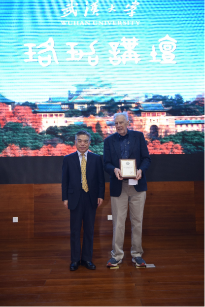 党委常委、副校长唐其柱教授为John E .Hopcroft教授颁赠珞珈讲坛纪念牌。本科生院院长吴丹教授、人工智能研究院副院长杨志坚教授、足球欧洲杯