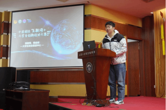 大学生创业促进中心宣讲团成员胡成超同学向到场的同学们介绍了“互联网+”大赛的赛事意义,赛事规则,时间安排,赛道划分,分析了不同赛道的评比重点与内容区别,并分享了自己的备赛建议。