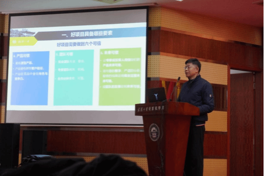 总教练,先后指导10余支团队摘得金奖。张老师为同学们详尽地解读了赛事政策的最新变动,并深入阐述了打造优秀项目的“六个可信”标准。他还从实践角度出发,具体指导同学们如何精心制作路演ppt,以及如何有效地进行ppt展示。通过分享优秀案例和大赛经验,张老师帮助同学们深入了解了比赛过程中可能遇到的常见问题和解决方法。