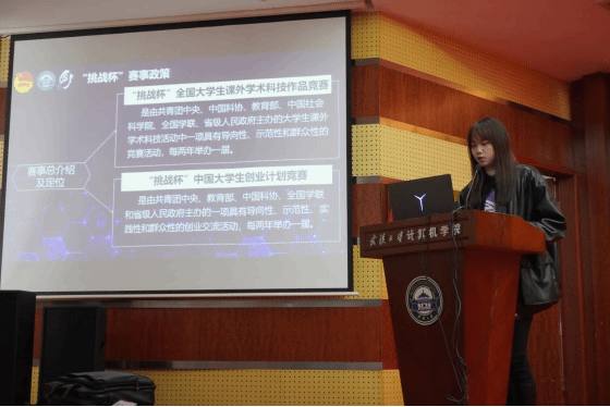 大学生创新实践中心宣讲团成员李雨轩同学从挑战杯赛事相关政策,赛事规则,备赛要点,信息获取渠道四个方面具体介绍了“挑战杯”赛事。