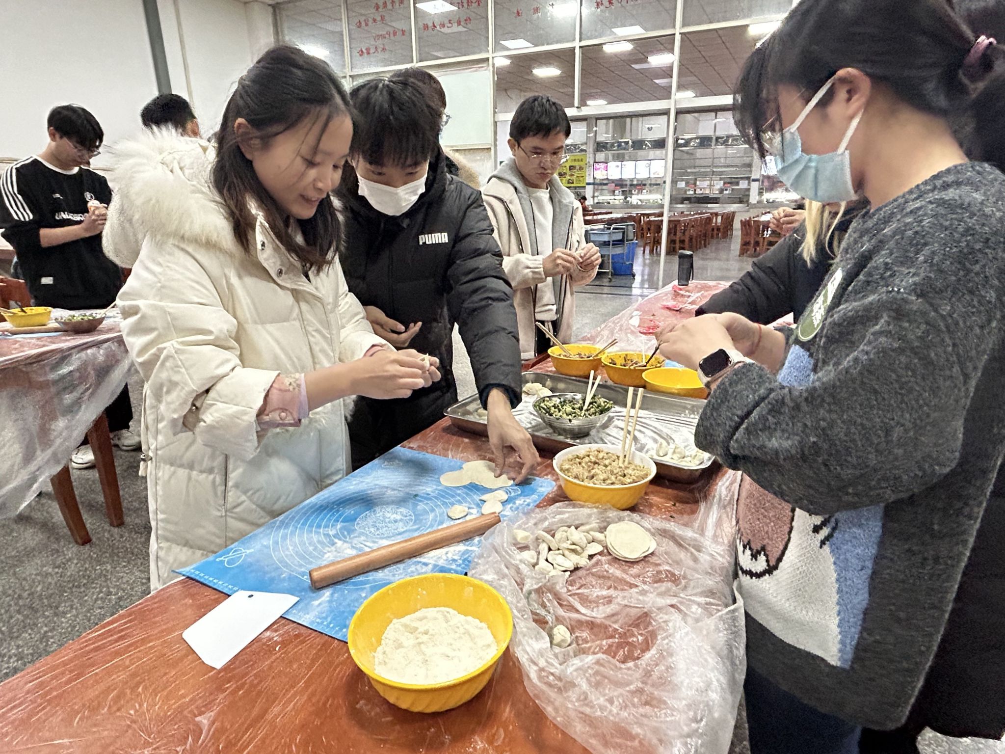 活动开始,同学们按照所属研究生组织分组到达信息学部第三食堂北厅进行准备工作。研究生辅导员史然介绍了饺子的由来、冬至气候特征、饮食习俗等相关文化背景。随后,后勤餐饮工作人员为同学们现场示范擀皮和包饺子的基本技巧与手法,一对一指导、手把手教学。同学们纷纷撸起袖子齐上阵,撒面粉、揉面团、切剂子、盛馅、擀皮、包饺子,分工明确,各显身手,热闹非凡。