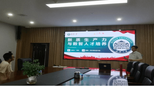 李兵老师做“新质生产力与数智人才培养”的主题党课。李老师介绍了新质生产力的由来,定义及如何发展新质生产力;接着指出数智生产力是最重要的新质生产力,数智科技革命主要是通过数字化、智能化等技术促进人们生产方式、生活方式和思维方式的变化,数智生产力促进形成新的生产关系;发展新质生产力需要拔尖创新人才。最后,李老师对数智人才必须具备的多种能力及AI对教育的影响进行了分析并提出了自己的看法。
