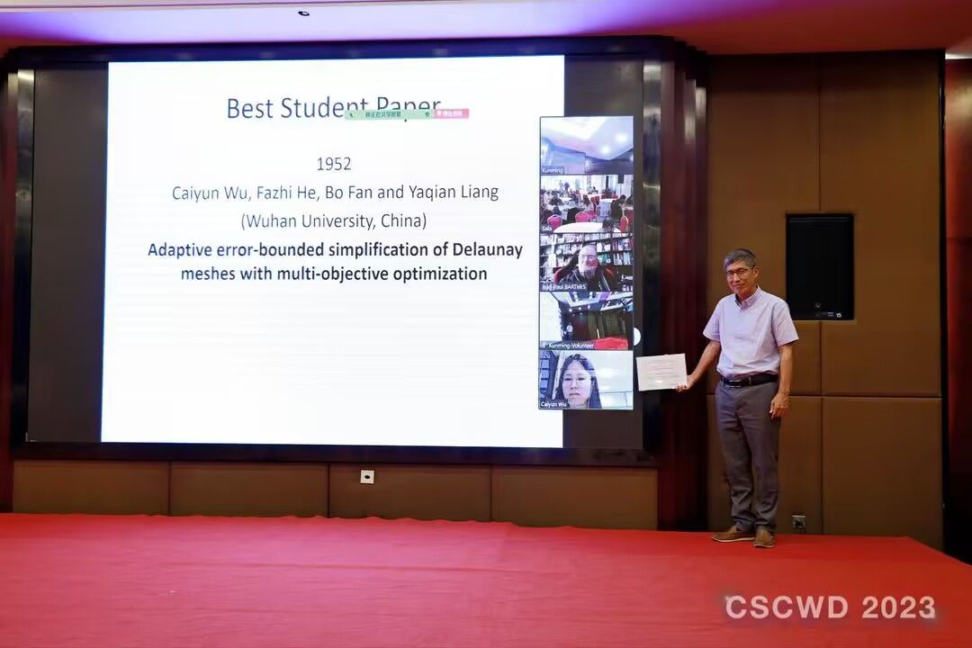2023年5月26日,在IEEE计算机支持协同设计国际会议(International Conference on Computer Supported Cooperative Work in Design,CSCWD)的闭幕式上,我院硕士生吴彩云同学(指导老师何发智教授)论文《Adaptive Error-bounded Simplification of Delaunay Meshes with Multi-objective Optimization》,荣获最佳学生论文奖。