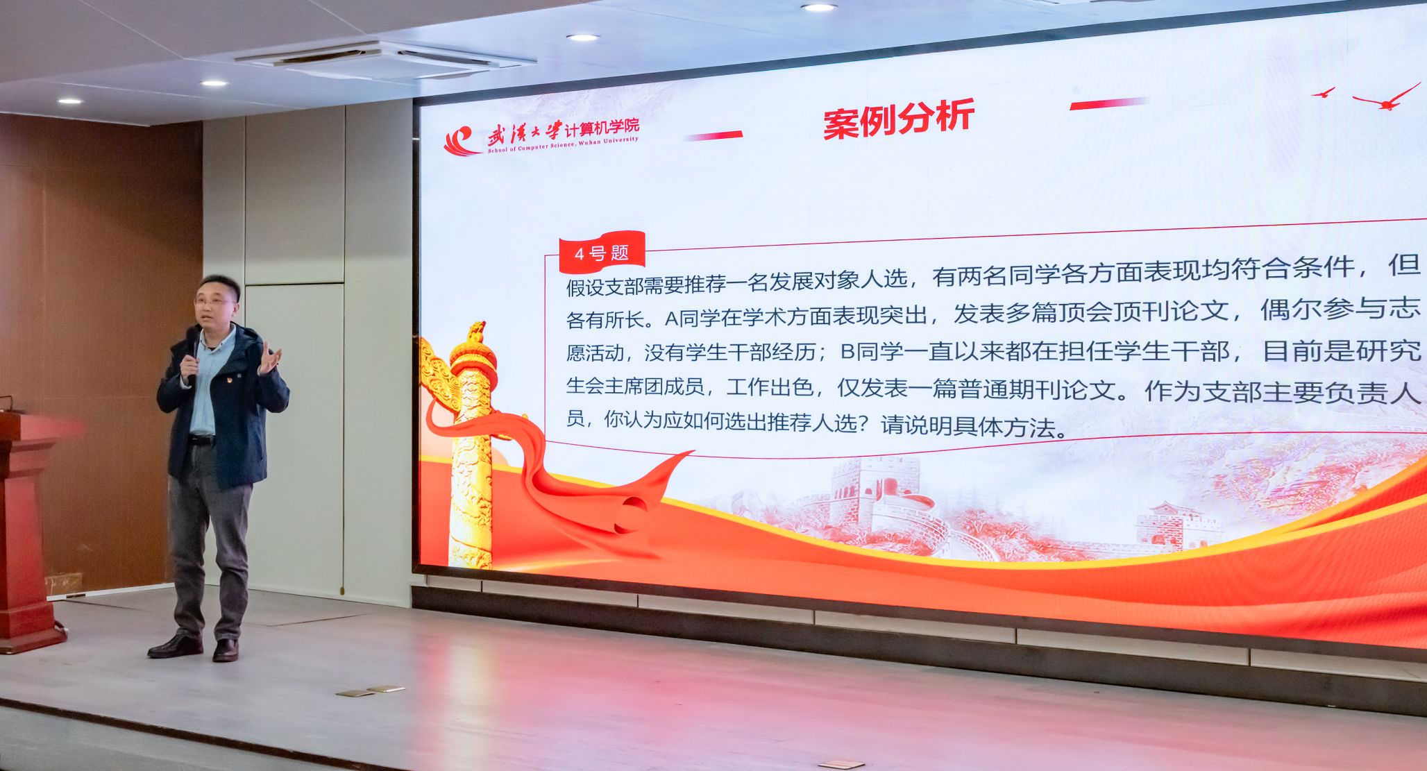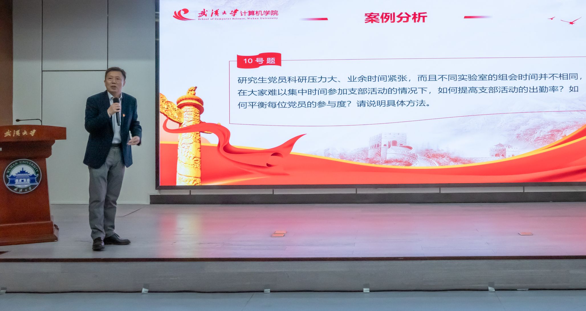 参赛代表作答结束后,主持人就本环节未被抽到的两个典型案例邀请瞿书记和高书记分享见解。针对支部成员时间难以协调导致支部活动出勤率低的问题,瞿书记提出将党支部建在实验室或课题组的有效方案,依托科研团队开展支部活动,推动党建与业务深度融合;针对推选发展对象时科研成果与社会活动经历的条件判断问题,高书记建议支部采取与候选人谈话的方式,重点考察其思想是否成熟,并从学术科研和宗旨意识等多方面提出改进建议,引导每位同志全面发展。
