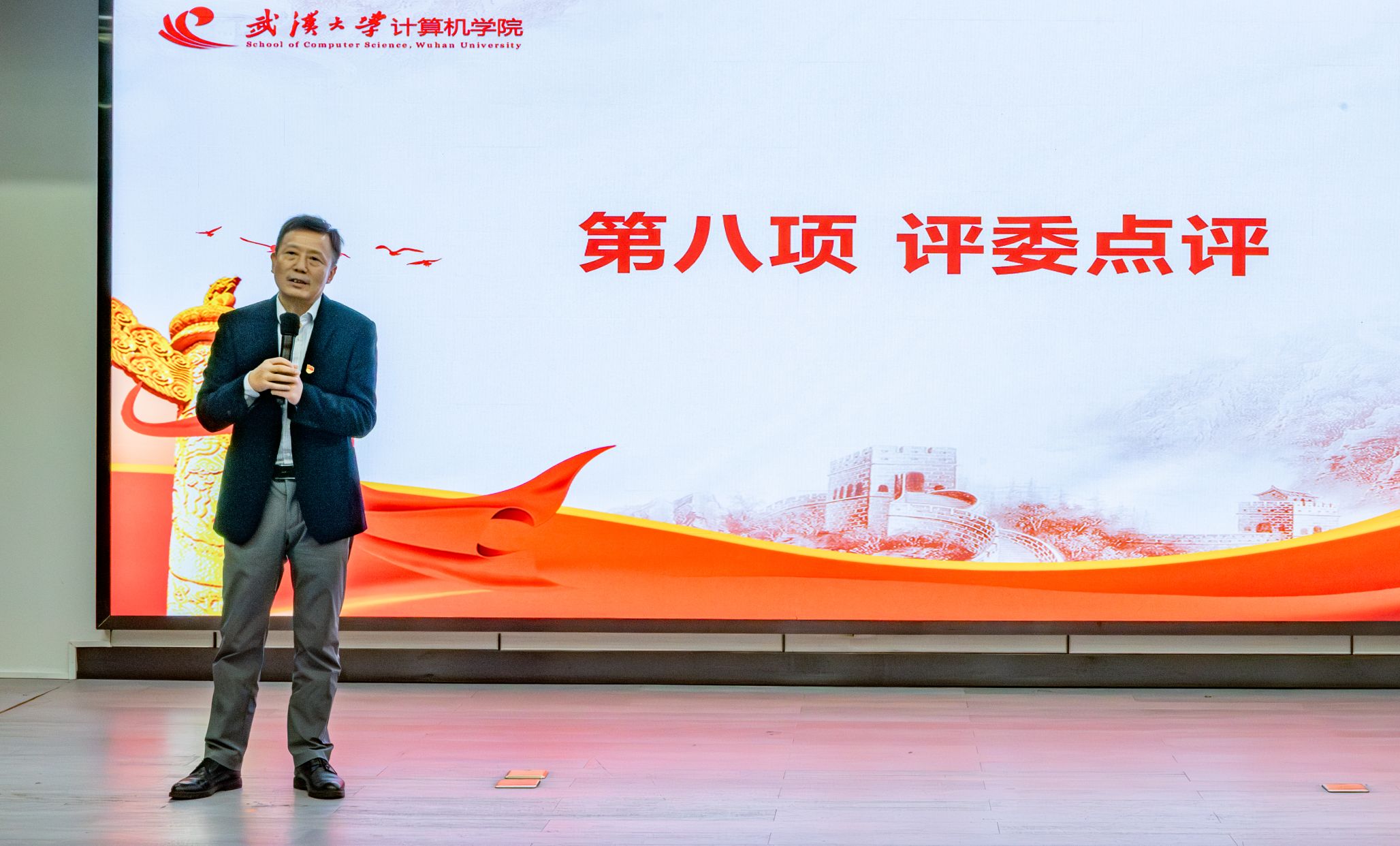 在各参赛队伍的精彩展示环节后,瞿成雄书记受邀对比赛进行点评。瞿书记在点评发言中表示,本次活动中8支参赛队伍都展示出了丰富多彩的内容和积极向上的精神状态,既生动弘扬了“科学家精神”,也礼赞了改革开放的伟大成就,同时展现了各专业的特色和研究生党支部的青春风采。