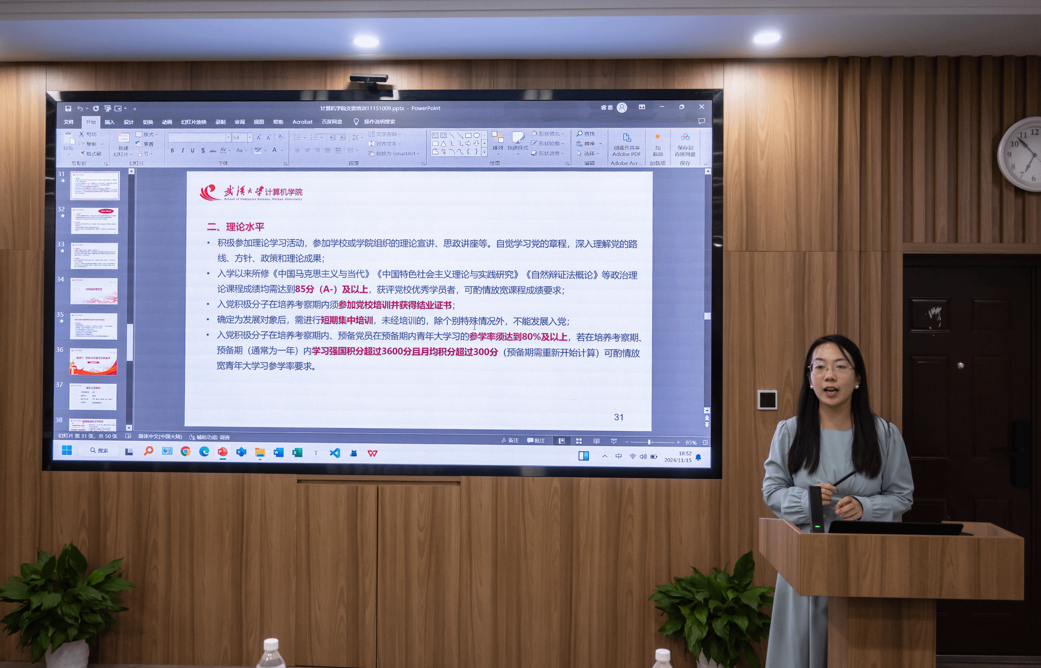 会议第三项,党总支党员发展办公室曾思绮作“党员发展工作流程”专题培训。曾思绮同志详细讲解了发展党员的各个关键阶段,并详细阐述了发展对象的考察和培养过程中的注意事项。她从申请入党、确定积极分子、发展对象、预备党员接收直至转正的整个过程进行详细讲解,并结合党员档案核查过程中发现的具体问题强调了材料规范填写的重要性。