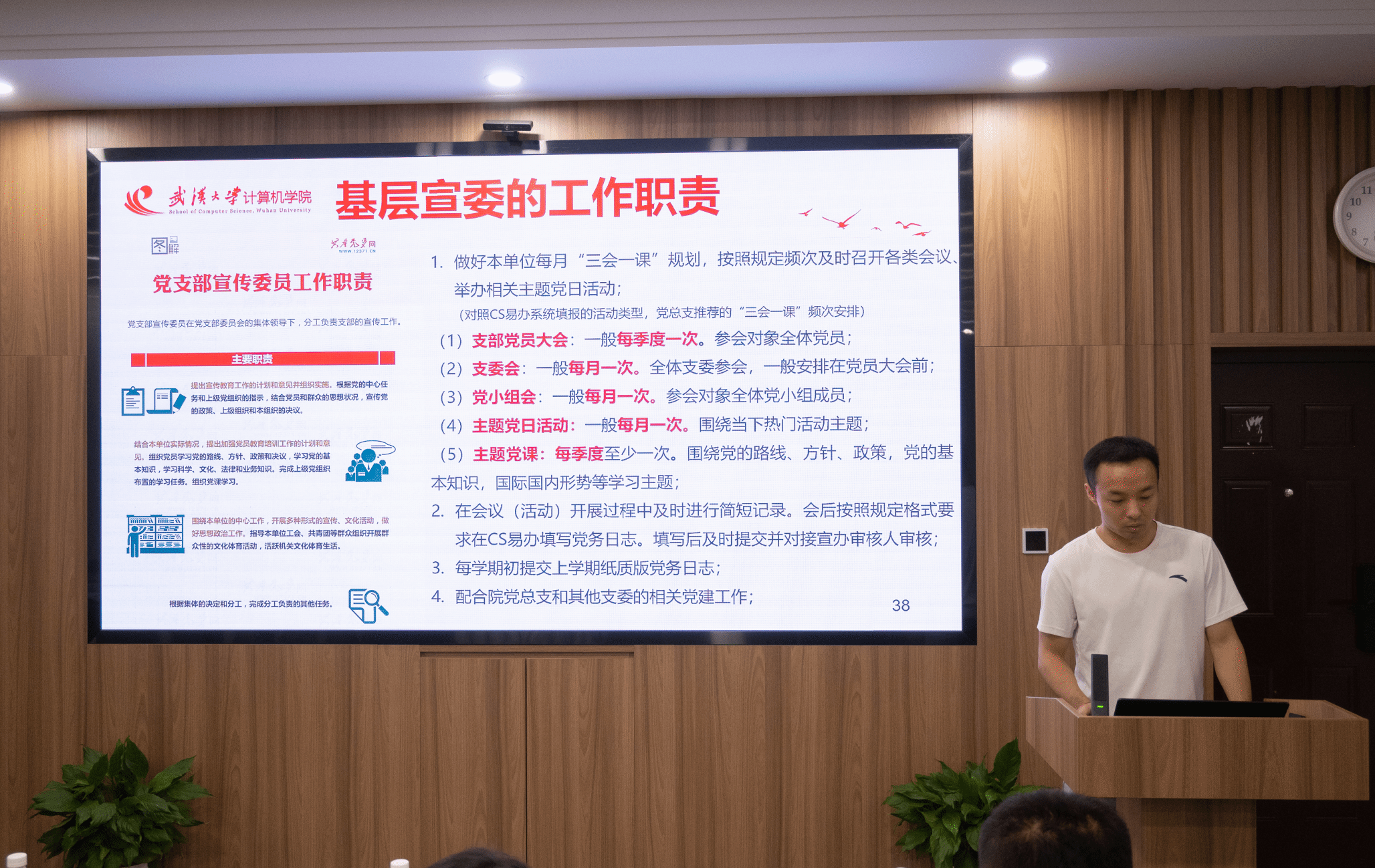 会议第四项,党总支宣传教育办公室梁川同志作“党务日志填写规范”专题培训。梁川同志结合党支部宣传委员工作职责和学院“CS易办”平台,详细介绍了党务日志填报的格式要求、审核流程以及现存问题,并列举优秀支部工作案例,为参训支部委员展示研究生党支部“三会一课”的工作成效。
