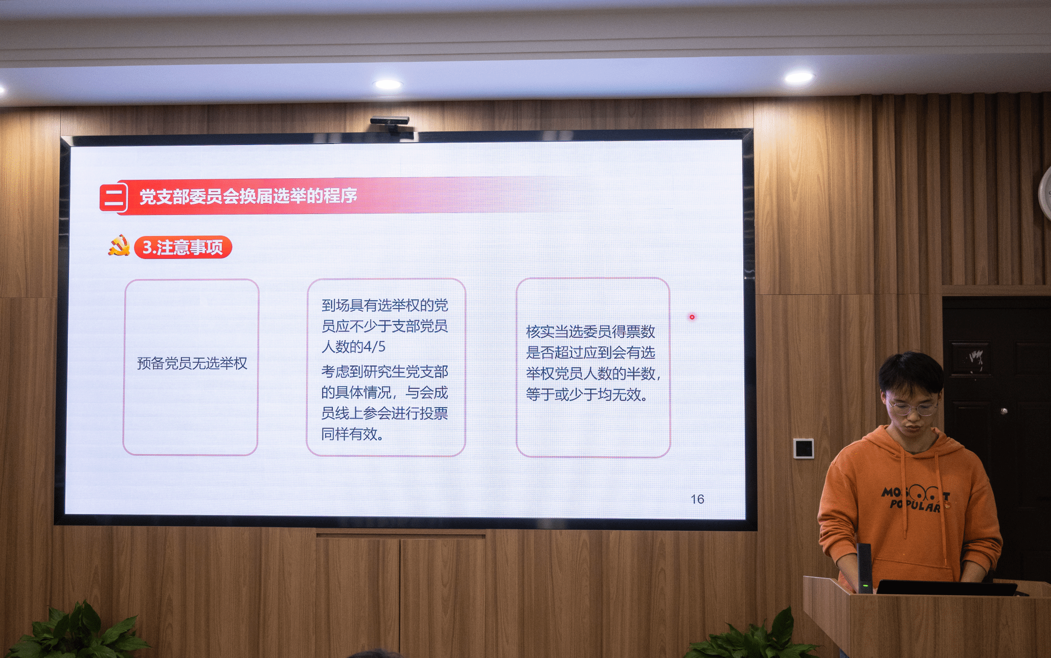 会议第二项,党总支组织建设办公室彭向旭同志作“支部换届注意事项”专题培训。彭向旭从支部换届的步骤和注意事项出发,详细讲解了换届前的准备工作、候选人资格审查、换届选举的规范程序以及选举结果的处理等选举程序和实际操作中需要注意的细节。