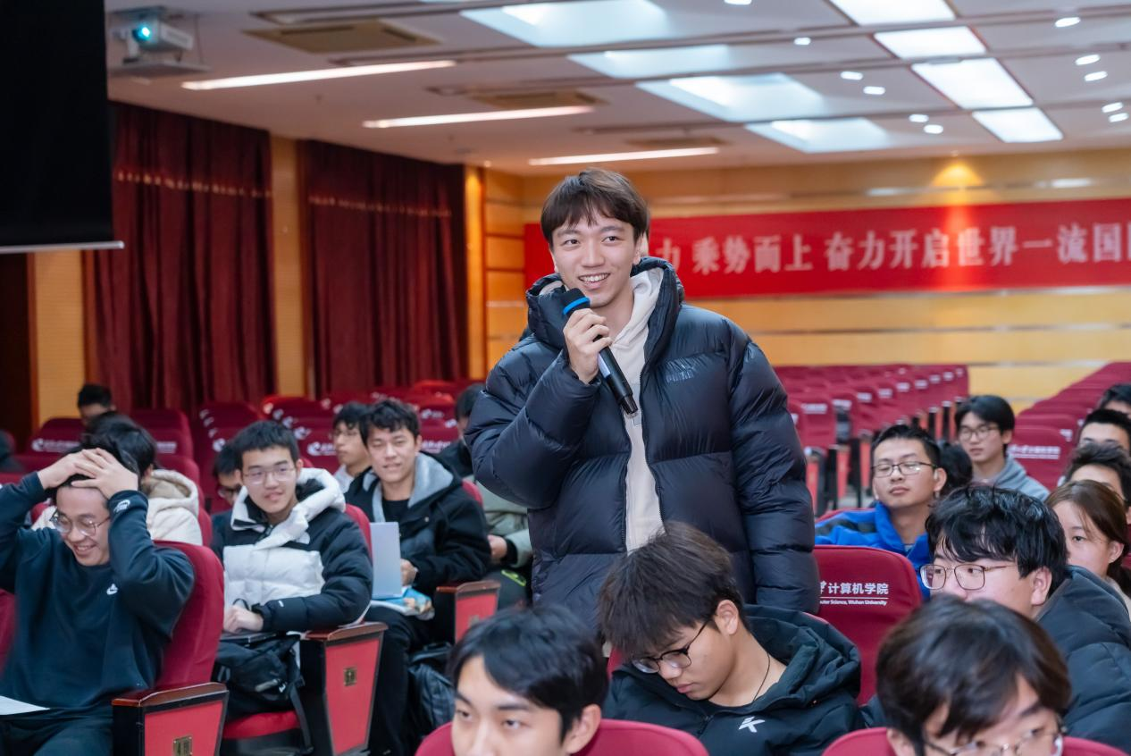 见面会结束后,陈小平在学院八楼报告厅为2024级特色班的全体同学们作了题为“大学 决定你的一生”的主题报告。在报告会现场,陈小平结合个人学习经历、创业经验等,向同学们介绍人工智能领域的前沿技术、发展趋势以及大学发展建议。其中他特别给同学们提出IQ、EQ以外的SQ,即:Social Quotient社交商数,鼓励同学们在大学要多外出实践、多与人交流,“3Q”理论的讲解与分析引发在场同学们的热烈讨论。