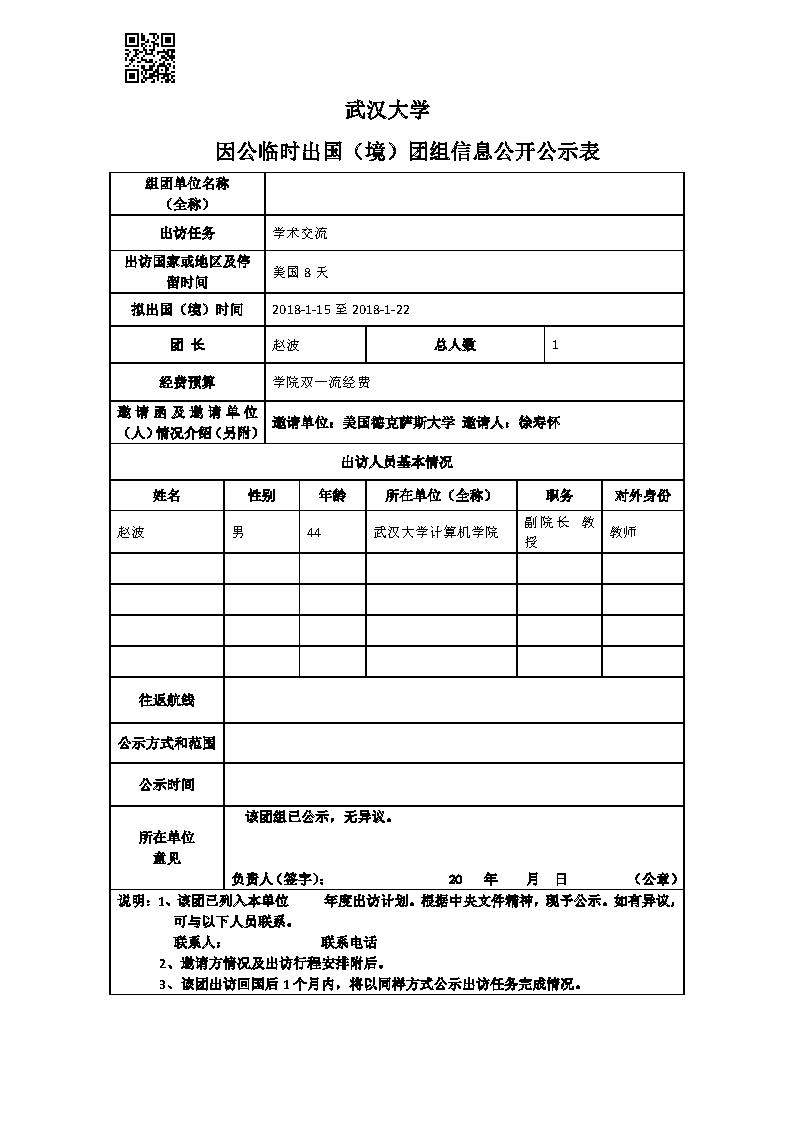 因公出国公示(赵波 美国)